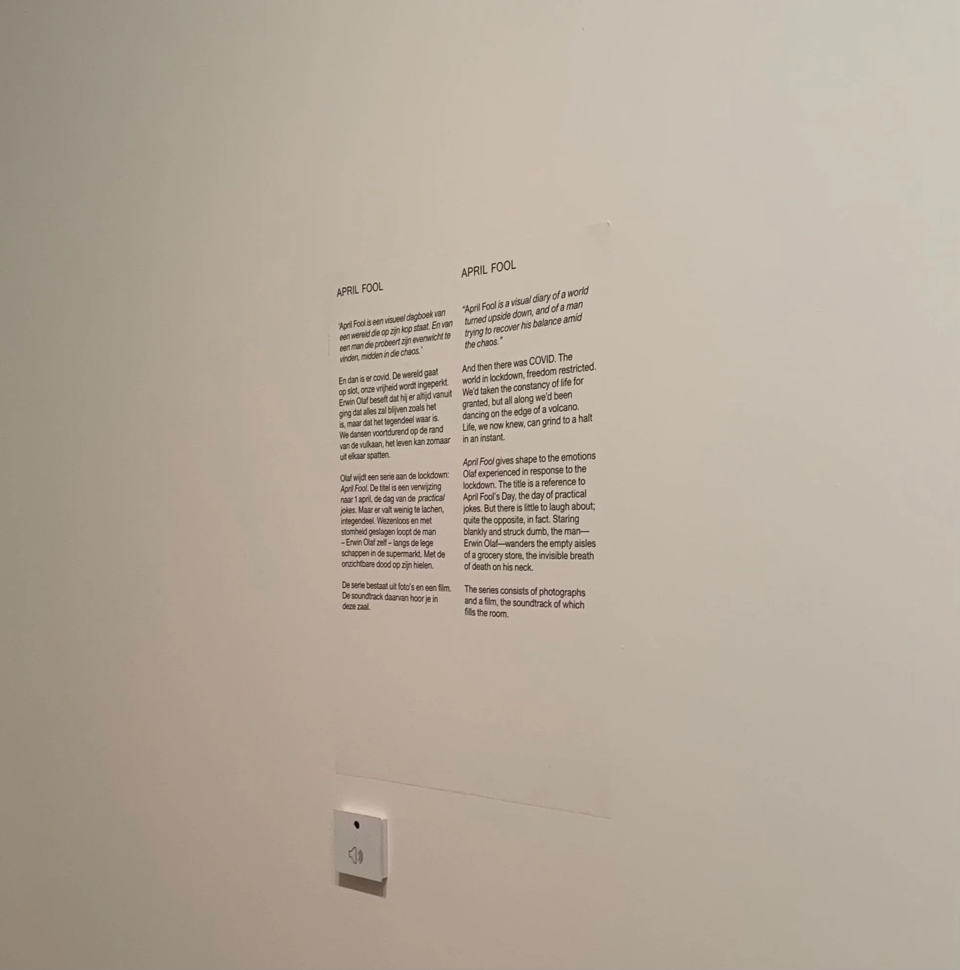 Moving on to the next point, in the museum, the print is accompanied by the short text of April Fool, where Meijer writes about the strange choreography of the early pandemic: the fear, the stillness, the rituals we invented to make the days bearable. You don’t need to read it to feel that context. It’s already in the photograph - the sense of being alone and observed at the same time, of staging yourself for an invisible audience.